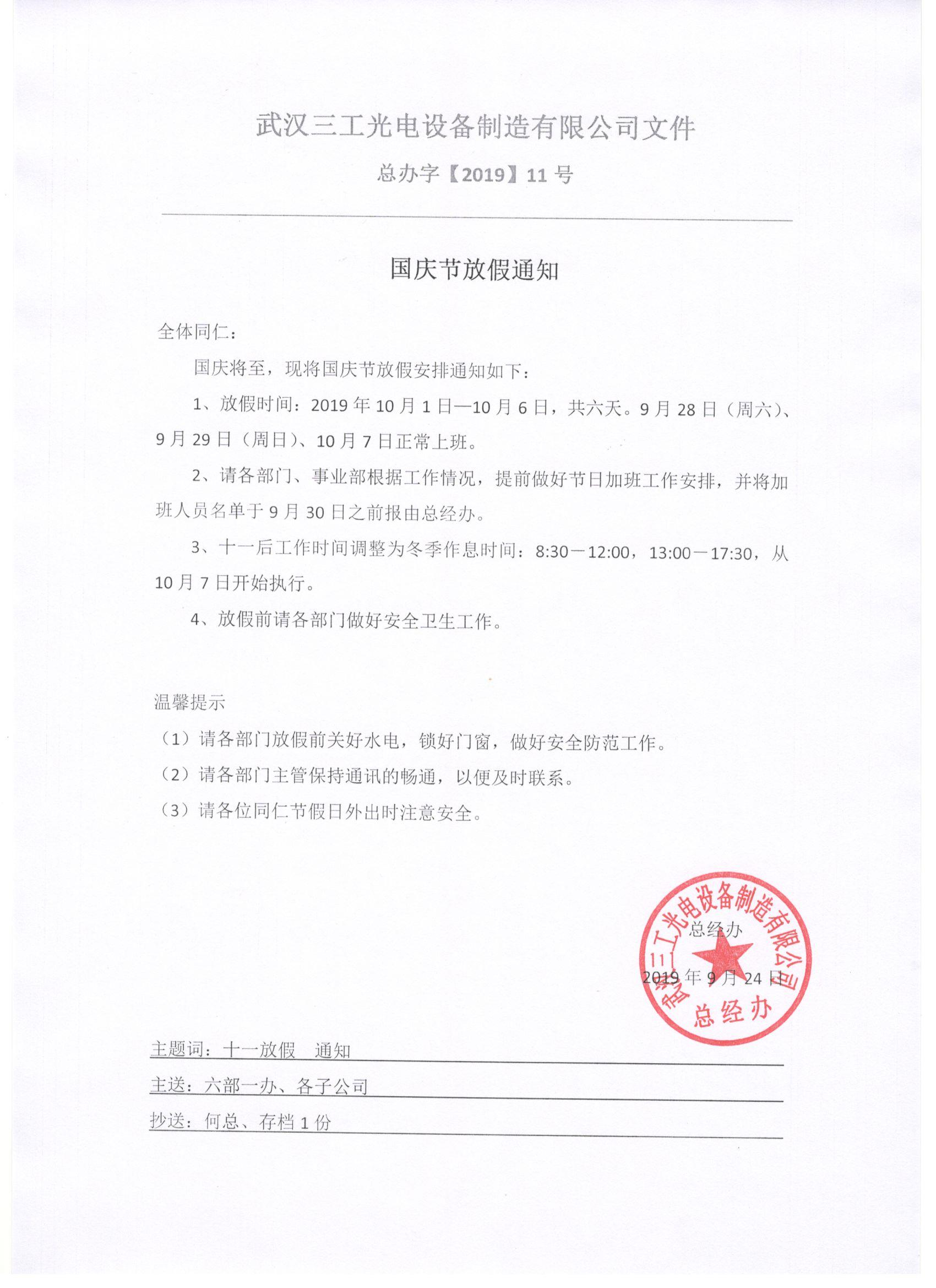 武漢三工2019年國慶放假通知