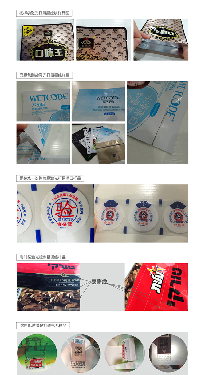 武漢三工激光是國(guó)內(nèi)率先針對(duì)薄膜包裝行業(yè)提出激光代替機(jī)械加工工藝的企業(yè),專(zhuān)為薄膜易撕線、定量透氣孔而設(shè)計(jì)與開(kāi)發(fā)的。與傳統(tǒng)的機(jī)械齒輪壓孔相比速度更快,孔徑孔距大小可調(diào)更加均勻,可以實(shí)現(xiàn)任意方向任意形狀易撕孔(線)標(biāo)刻。激光工藝制作是一種瞬間高溫處理使孔周?chē)鸁崛诒Wo(hù),因此完全解決了后期熱收縮后出現(xiàn)的斷裂現(xiàn)象,在手感上也非常平滑,在感官上給客戶(hù)一種新的體驗(yàn)。激光易撕線和透氣孔的諸多優(yōu)勢(shì)我們前面已經(jīng)講到過(guò)很多,再次不做贅述,下面一起來(lái)看一下我們易撕線激光打孔劃線機(jī)做的不同行業(yè)以及材料的樣品吧!